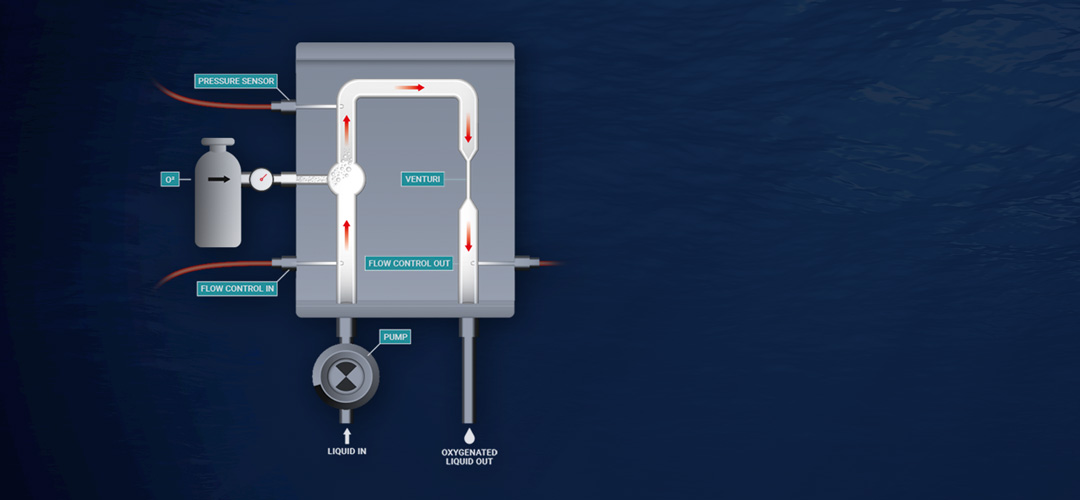 After the oxygen is mixed with water in turbulence, the mixture is lead into a venturi. The venturi is a constriction of the tube that reduced the water pressure but increases the flow. After the constricted part of the venturi, the diameter is increased; increasing the pressure but reducing the flow speed. During this process nanobubbles are generated by supersaturated cavitation.